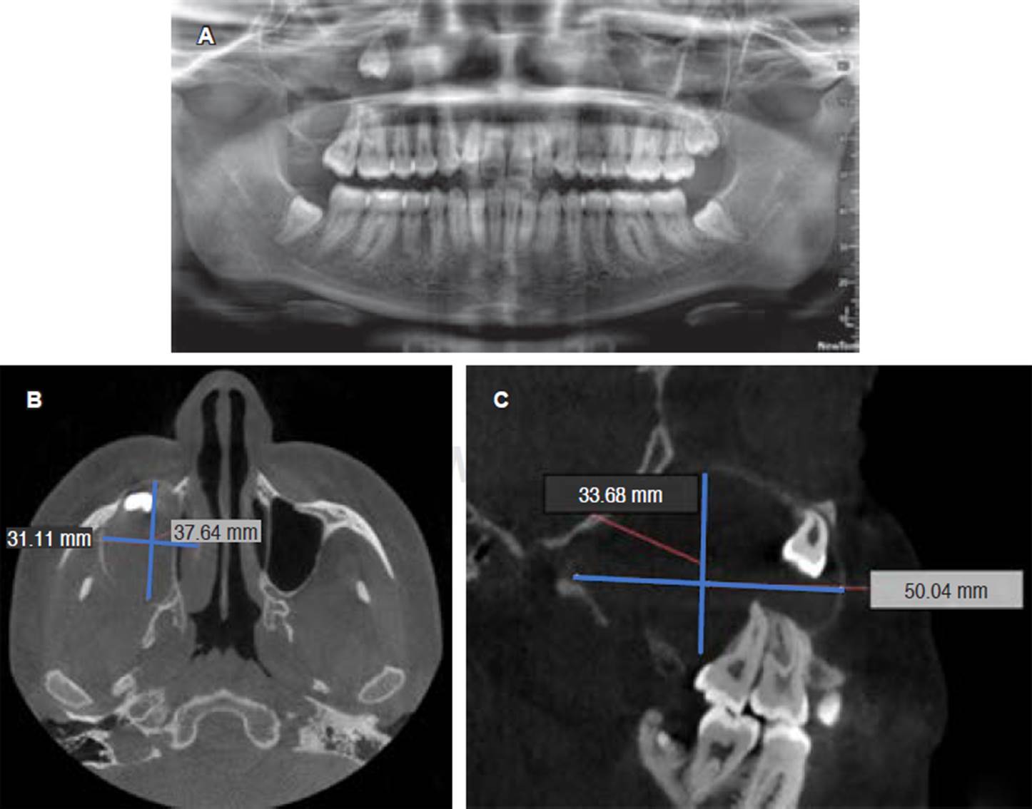 Figura 1 A) Ortopantomografía inicial en la cual se puede observar lesión asociada a OD 18. B) Corte axial de tomografía cone beam. C) Reconstrucción sagital de tomografía cone beam en la cual se observa relación de OD 18 con piso de órbita y lesión hipodensa asociada a corona dental del mismo.