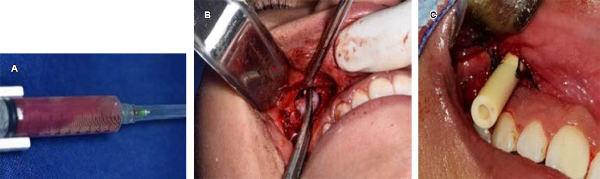 Figura 2 A) Punción exploratoria en la cual se obtuvo líquido amarillento compatible con queratina. B) Toma de biopsia incisional de la lesión. C) Drenaje colocado en cavidad quística.