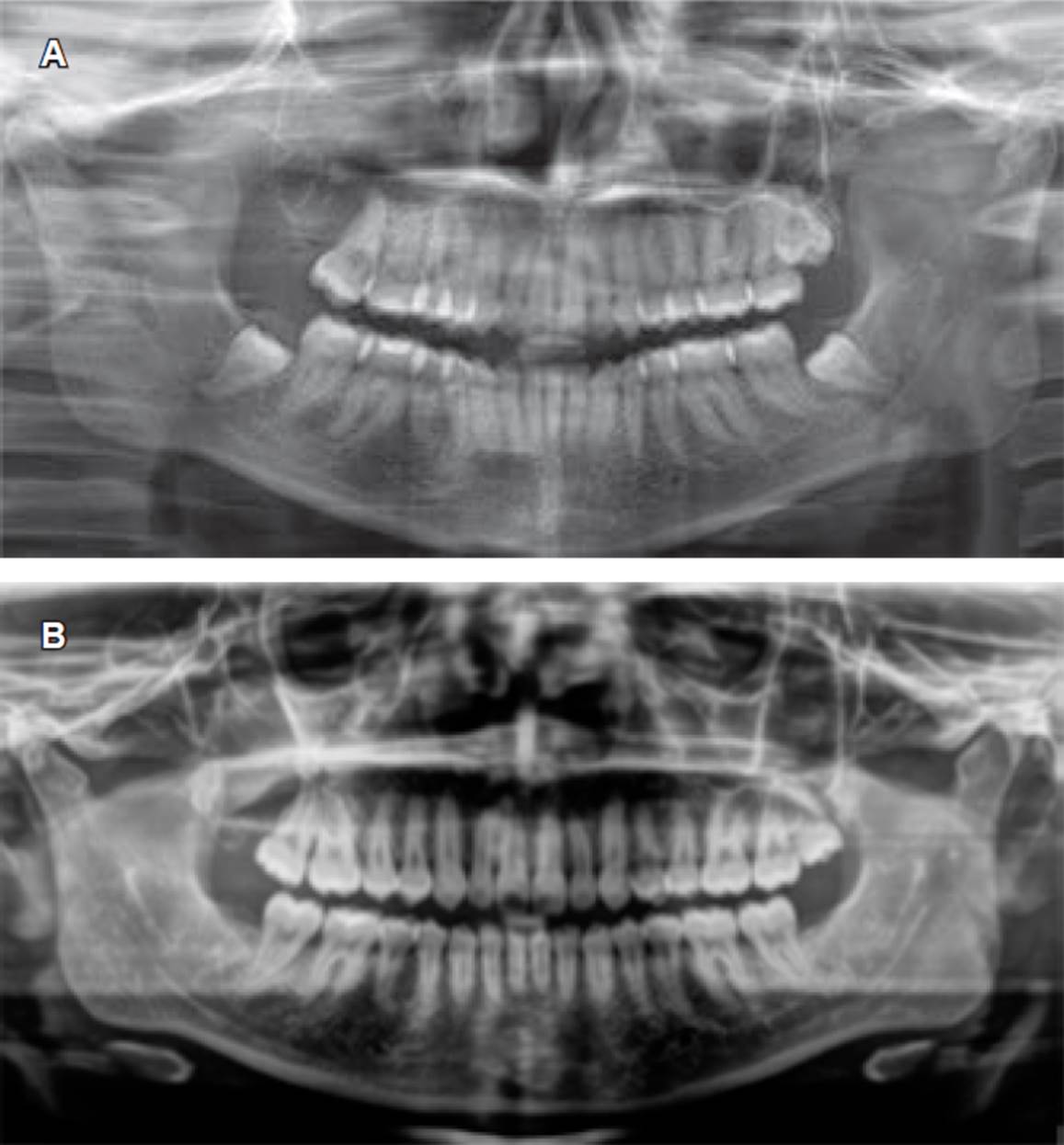Figura 3 Ortopantomografía. A) Ocho meses posteriores a la descompresión quística, se observa la ausencia de OD 18 y cavidad quística delimitada con bordes definidos. B) Control a treinta meses posteriores a enucleación y aplicación de 5-fluorouracilo.