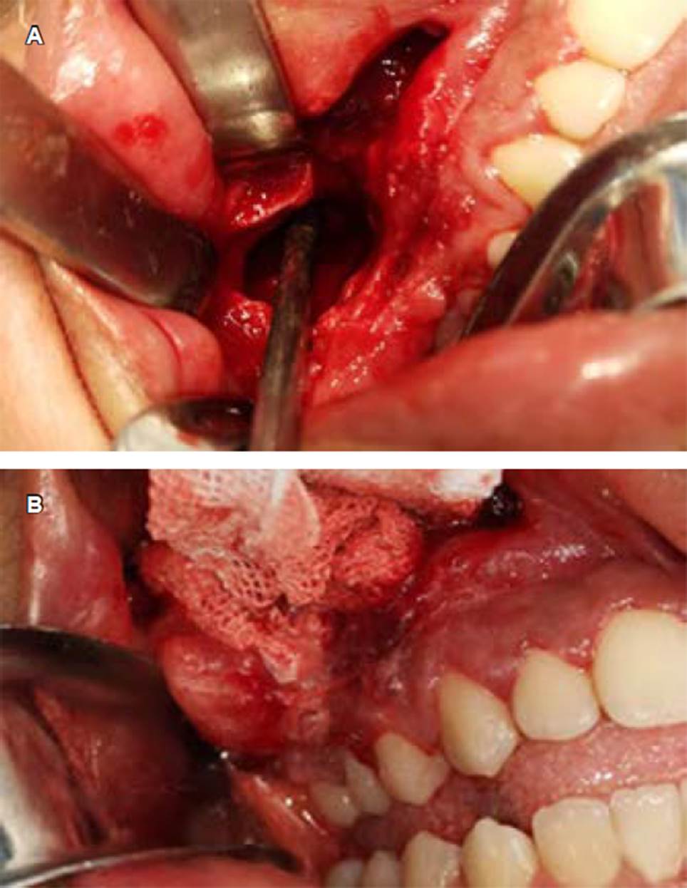 Se envió la muestra al Departamento de Patología de la DEPeI y se emitió el diagnóstico de queratoquiste odontogénico. Se decidió continuar con la descom presión de la cavidad quística hasta alcanzar un tama ño óptimo para la enucleación y la extracción de ésta. Se dio cita de control mensual y seguimiento radio gráfico de la lesión cada cuatro meses. Ocho meses posteriores a la colocación del drenaje quístico, se ob servó en la ortopantomografía un cambio de densidad alrededor de la lesión, así como una mayor delimitación de la misma, por lo que se realizó la enucleación y la colocación de 5-fluorouracilo para su tratamiento (Figura 3A). Se comenzó con un abordaje a través de la pared anterior del seno maxilar, se procedió a la enucleación y curetaje del epitelio quístico, una vez retirado el tejido en su totalidad, se colocó una gasa embebida de 5-fluorouracilo (Efudix®) al 5% utilizando aproximadamente 1 g y se citó a la paciente para re tiro de la gasa a las 24 horas (Figura 4). Concluidas las 24 horas se retiró el material colocado en el sitio de la enucleación y se realizó el cierre hermético de la mucosa bucal. Se envió la muestra completa para estudio histopatológico de la lesión y se corroboró el diagnóstico de queratoquiste odontogénico.