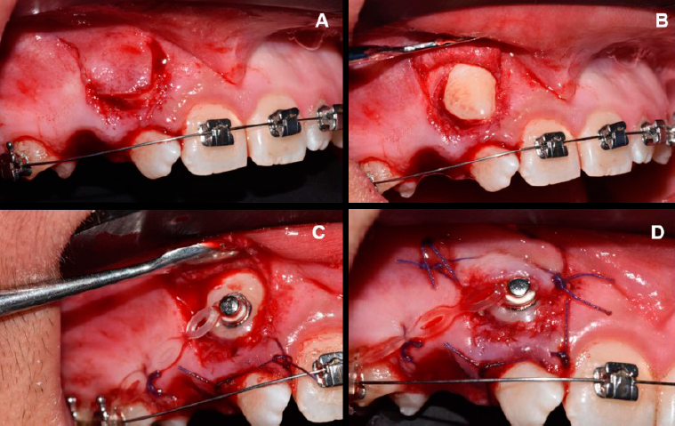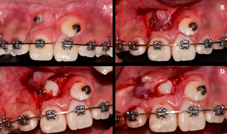 Figura 1 Técnica de cirugía plástica periodontal para la exposición del diente 13. Caso1. A. Diseño de un colgajo espesor parcial que se reposicionará apicalmente. B. Exposición del diente 13. C. Colocación del botón de ortodoncia. D. Reposición apical del colgajo a partir de puntos simples y sutura de ácido poliglicólico 6-0.