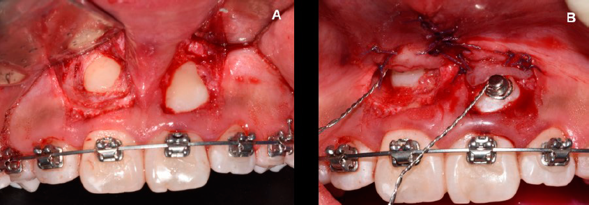 Figura 2 Técnicas de cirugía plástica periodontal para la exposición de los dientes 13 y 23. Caso 2. A. Diseño de un colgajo de espesor parcial que se reposicionará apicalmente sobre ambos dientes. B. Colocación de botones de ortodoncia y reposición apical de los colgajos a partir de puntos simples y sutura de ácido poliglicólico 6-0.