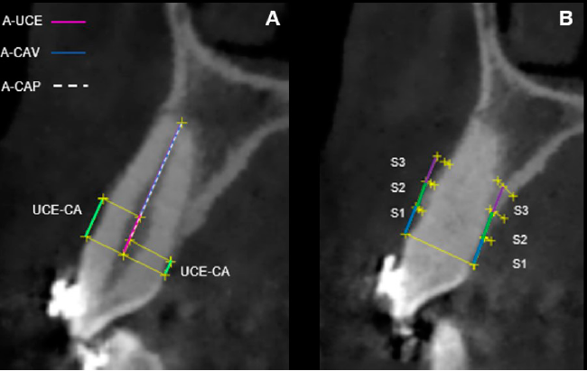 Figura 4 Análisis tomográfico. Esquema para calcular la altura ósea (AO) y el soporte óseo (SO) vestibular y palatino de los caninos expuestos a los dos años posquirúrgicos. Las líneas verdes identifican la distancia unión cemento esmalte-cresta alveolar (UCE-CA) tanto en la región vestibular como palatina, la línea rosa identifica la distancia ápice-unión cemento esmalte (A-UCE), la línea azul marca la distancia ápice-cresta alveolar vestibular (A-CAV) y la línea blanca entrecortada identifica la distancia ápice-cresta alveolar palatina (A-CAP). El porcentaje óseo fue calculado dividiendo la distancia ápice-cresta alveolar para la distancia ápice-unión cemento esmalte. Esquema para calcular el grosor óseo (GO) vestibular y palatino de los caninos expuestos a los dos años posquirúrgicos. Tomando como referencia la distancia entre la superficie de la raíz y la cortical, perpendicular al eje longitudinal del diente, a 3 mm (S1), 6 mm (S2) y 9 mm (S3) (líneas azules, verdes y moradas respectivamente) de la unión cemento esmalte.