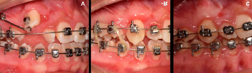 La tracción del diente 13 se activó en el momento de la colocación del botón ortodóncico con una cadena elástica de segunda generación cerrada Ormco®, en dirección al diente 14, para guiar la erupción (Figura 1. C-D). La tracción se llevó a cabo de manera intermitente desde la exposición del diente hasta el noveno mes de seguimiento ortodóncico donde se logró posicionar al diente con fuerzas ligeras y continuas al año posquirúrgico.