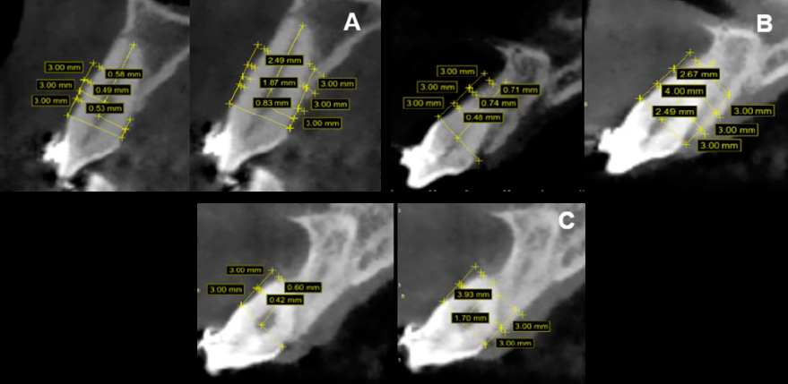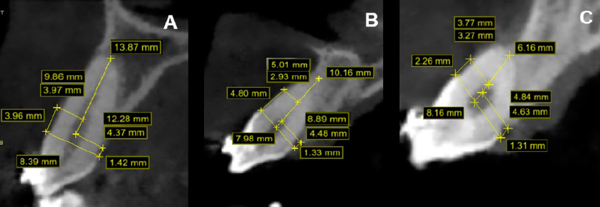En los parámetros tomográficos para el diente 13, AO en la región vestibular fue mayor (4.80 mm) en relación con la AO palatina (1.33 mm); el porcentaje de SO vestibular fue menor (49%) en relación con el porcentaje de SO palatino (87%). Para el diente 23, AO en la región vestibular fue mayor (2.26 mm) en relación con la AO palatina (1.31mm); el porcentaje de SO vestibular fue menor (61%) en relación con el porcentaje de SO palatino (78%) (Tabla 1) (Figura 6. B-C).