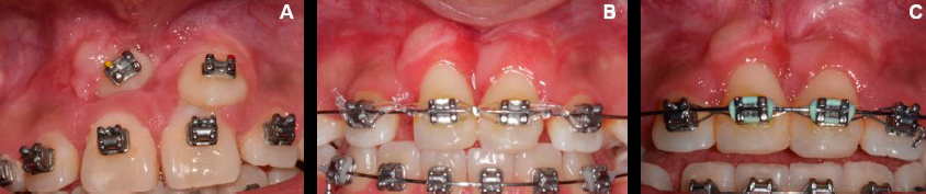 Figura 5 Valoración de tejido queratinizado obtenido alrededor del diente 13, posterior a la cirugía. El tejido siguió al diente durante sus movimientos y es comparable con el de los dientes adyacentes. A. 6 meses posquirúrgicos. B. Al año posquirúrgico. C. A los dos años posquirúrgicos.