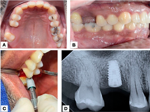 Figura 1 Fotografías iniciales. A. Oclusal pre-operatoria del maxilar. B. Lateral izquierda (pre-operatoria). C. Colocación de implante en zona del diente 16. D. Radiografía dentoalveolar digital post-operatoria.