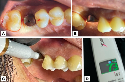 Figura 2 Colocación del pilar de cicatrización sobre implante en zona del diente 16. A. Vista oclusal. B. Vista lateral. C. Medición de la estabilidad en unidades IST con el medidor AnyCheck® sobre el pilar de cicatrización. D. Resultado de la medición (73 IST) en la pantalla LCD del dispositivo AnyCheck®.