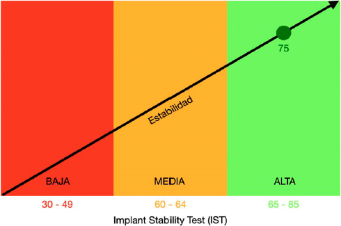 Figura 3 Valor de estabilidad implantaria mediante el AnyCheck®, conseguido a las 12 semanas de la colocación del implante. Las 75 IST obtenidas corresponden a una estabilidad alta con un bajo riesgo de fracaso.