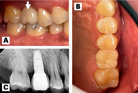 Tres semanas después de perfilar el tejido blando, se tomó la impresión con un kit protésico (Complete Prosthetic Kit (CPK), MIS® Implants Technologies Ltd., Northern District, Israel), mismo que obliga a trabajar con una prótesis cementada. Las ventajas clínicas de esta decisión fueron: trabajar cómodamente en una apertura bucal ligeramente limitada; se disminuyeron considerablemente los costos para el paciente, así como la cantidad de citas en la clínica. Conjuntamente, se evitó una chimenea en la corona, otorgándole mayor estética y eliminando la necesidad de sellarla con resina. Dicha impresión se tomó con técnica de cucharilla cerrada y polivinil siloxano para su envío al laboratorio, y se procedió con la fabricación de una corona monolítica de zirconio (Classic zirconia, CAD-CAM software, Whitepeaks Dental Solutions GmbH, Hamminkeln, Alemania; milling machine, VHF Camfacture AG, Ammerbuch, Alemania) (Figura 4. A-B). Se realizaron pruebas oclusales y estéticas y, tras comprobar su correcto ajuste y color, fue cementada con cemento temporal (Temp-BondTM NE, Kerr Corporation, Orange, Estados Unidos) para una posible recuperación en caso de ser necesario. Se corroboró la oclusión con papel de articular de 40 micras (Bausch Arti-Check®, Dr. Jean Bausch GmbH & Co. KG, Colonia, Alemania). También se tomó una radiografía dentoalveolar digital final (Figura 4. C) para corroborar el ajuste de la prótesis, en donde se observó un correcto asentamiento tanto del pilar protésico como de la corona. Se le dieron al paciente instrucciones higiénicas y las respectivas indicaciones post-operatorias y de mantenimiento.