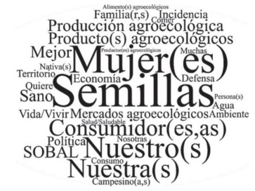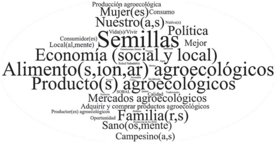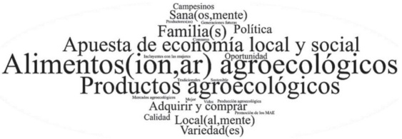 La relación de dependencia que tienen los campesinos/as con los mercados convencionales, a pesar de las condiciones poco favorables que les imponen, y ante la dificultad de acceder a otros mercados, hace de esta situación uno de los cuellos de botella para lograr la autonomía por parte de los campesinos/as. Por tanto, encontrar elementos en la nube de palabras como nuestros, nuestras, economía social, local son muy importantes, debido a que los MAE construidos desde su perspectiva son autogestionados por los productores/as agroecológicos/as, entre ellos coordinan temas de logística de funcionamiento (utensilios, infraestructura, horarios, días, trámites con gobiernos locales o entidades privadas para uso de espacios, etc.), productos a llevar al mercado (producidos por ellos mismos bajo los principios de la agroecología o en transición a esta), y precios.12