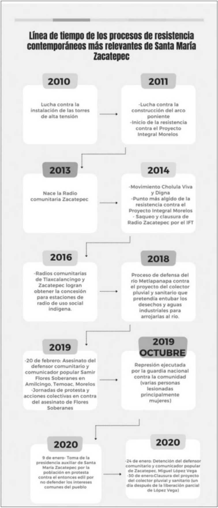 Como mencionamos anteriormente, el caso que se estudia en el presente trabajo es resultado de la acumulación histórica, la memoria colectiva, la herencia y la experiencia de resistencia que se ha ido construyendo desde los pueblos, a continuación se muestra una línea del tiempo en donde se podrá observar que existe una amplia experiencia organizativa y de resistencia en la región Cholulteca y de los Volcanes, específicamente en Santa María Zacatepec, estos procesos surgen como respuestas ante problemáticas que les son comunes a las personas que habitan ese territorio, hacemos un recorte de la realidad en el año 2010 como el inicio de esta serie de acciones colectivas comunitarias de carácter contemporáneo pero es claro que existe un proceso de larga data que estos pueblos y muchos otros reconocen como una lucha continúa, que lleva más de 500 años.