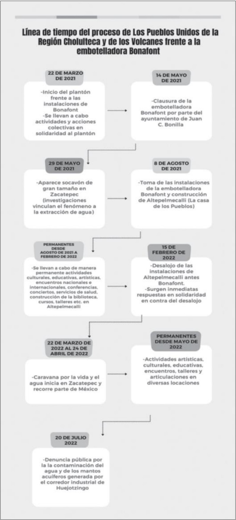 Figura 2 Línea de tiempo del proceso de los Pueblos Unidos de la región Cholulteca y de los Volcanes frente a la embotelladora Bonafont.