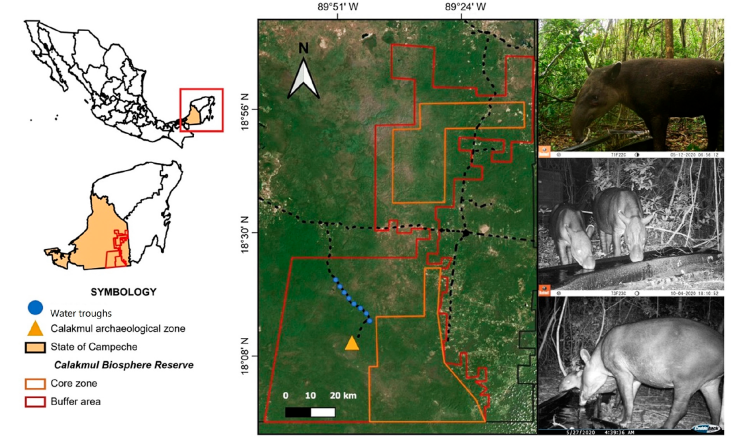 The Maya Forest is the largest tropical forest massif in Mesoamérica, located in southeastern Mexico, northern Guatemala, and northeastern Belize, with more than 30,000 km2 under some category of protection (Reyna-Hurtado et al., 2022). This region concentrates the largest population of tapirs in Mexico (Naranjo et al., 2015). In recent years, it has been documented that temperatures in the Yucatán Peninsula have become extremely high and have longer periods (Mardero et al., 2020), which forces wildlife to resort to water sources to thermoregulate (Contreras-Moreno, Jesús-Espinosa, Cruz-Romo et al., 2024; Contreras-Moreno, Jesús-Espinosa, Sánchez et al., 2024; Hidalgo-Mihart et al., 2024). This is accentuated in the Maya Forest where natural water bodies are restricted to “aguadas” (i.e., small ponds that fill with rainwater; Reyna-Hurtado et al., 2022) and “sartenejas” (i.e., hollows that form in rocky soil because of erosion and accumulated rainwater; Delgado-Martínez et al., 2018).