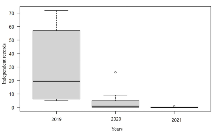 With a sampling effort of 4,672 camera-trap days, 289 independent tapir records were obtained, and a PIV of 61.21 records/1,000 trap days in artificial water troughs in the CBR (Table 1). Regarding tapir records, highly significant differences were observed when comparing the 3 sampling years (H = 17.78, df = 2, p < 0.001; Fig. 2a), with the use of the troughs in 2019 being significantly higher than in 2020 and 2021. When comparing tapir records between sampling stations, no significant statistical differences were observed (H = 4.73, df = 7, p = 0.69).