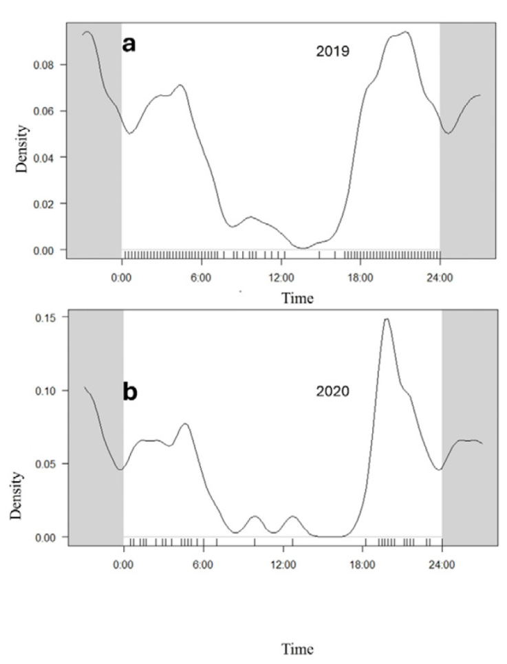 The activity pattern was evaluated for Central American tapir in the study. To compare the statistical differences between the hours of greatest activity a Kernel density analysis we used the activity and overlap packages in R 3.4. 0. (R Core Team, 2017; Ridout & Linkie, 2009; Rowcliffe, 2016).