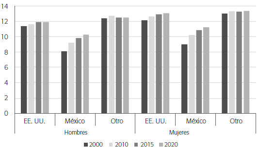 Gráfica 1 AÑOS DE ESCOLARIDAD POR PAÍS DE NACIMIENTO, 2000-2020