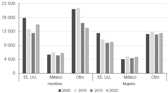 La gráfica 2 presenta el salario mensual para cada uno de los grupos separado por sexo y periodo. En el caso de los hombres, de 2000 a 2015 las mayores percepciones salariales las obtuvieron los inmigrantes de otros países; sin embargo, en 2020 los estadounidenses obtuvieron los mayores salarios donde esta cifra ascendió a 15 755.8 pesos, seguido por los extranjeros de otros países (14 667.3 pesos) y los mexicanos (6 579.6 pesos). Los salarios de los mexicanos siempre son sustancialmente menores que el de los otros dos grupos; no obstante, mientras que el salario promedio de los mexicanos creció 9.5 por ciento del año 2000 a 2020, el de los extranjeros de otros países cayó 29.1 por ciento y el de los estadounidenses se contrajo 11.7 por ciento. Por tanto, al igual que lo ocurrido con los años de escolaridad y en parte por ello, la brecha salarial entre los estadounidenses y extranjeros de otros países y los mexicanos se redujo considerablemente en los últimos años.
