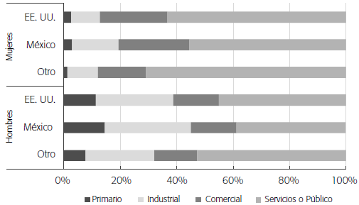Respecto al sector de empleo, la gráfica 3 muestra que los hombres estadounidenses se ocupan principalmente en los sectores servicios o público (el 45.1 por ciento), seguido del industrial (el 27.3 por ciento), el comercial (el 11.4 por ciento) y por último el primario (el 7.6 por ciento). De manera contraria, los mexicanos tienen una distribución más equitativa entre los distintos sectores con una mayor participación que los estadounidenses en el sector primario (el 14.4 por ciento) y en el industrial (un 30.6 por ciento), un nivel similar en el comercial (el 16.2 por ciento) y una menor participación en los sectores servicios o público (el 38.6 por ciento), aunque éste es el sector donde más se ocupan. En el caso de las mujeres, tanto estadounidenses como mexicanas se concentran en mayor medida en los sectores servicios o público (el 63.5 y el 55.4 por ciento), seguido del comercial (el 23.7 y el 25.1 por ciento), el industrial (el 10.3 y el 16.5 por ciento) y el primario (el 2.6 y el 3.0 por ciento), donde tienen poca participación.