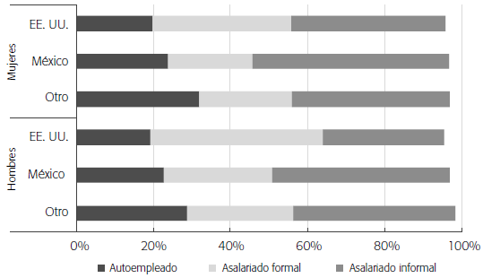 Finalmente, sobre el tipo de trabajador, la gráfica 4 muestra que los estadounidenses trabajan en mayor medida como asalariados formales (el 45.0 por ciento), seguido de asalariados informales (el 31.4 por ciento) y autoempleados (el 19.2 por ciento). Los mexicanos trabajan principalmente como asalariados informales (el 46.1 por ciento), asalariados formales (el 28.3 por ciento) y como autoempleados (el 22.6 por ciento). En el caso de las mujeres, tanto las estadounidenses como las mexicanas laboran en mayor medida como asalariadas informales (el 40.2 y el 51.2 por ciento), asalariadas formales (el 36.1 y el 21.9 por ciento) y autoempleadas (el 19.8 y el 23.8 por ciento).