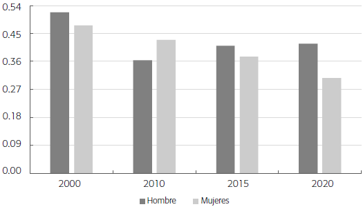Respecto a los años de escolaridad, en el 2000 un año adicional de estudio se asociaba con un aumento del salario del 8.5 por ciento; no obstante, para el 2020 esta cifra había disminuido al 6.2 por ciento. A pesar de esto, en todos los periodos son mayores los retornos a la educación presentados por las mujeres que por los hombres. Respecto al estar casada o unida, esto se asocia de manera negativa con el salario en 2015 y 2020, lo cual puede estar reflejando el hecho de que al vivir en pareja un número importante de mujeres se especializan en las actividades del hogar lo cual merma sus niveles de ingreso en el mercado de trabajo. El ser asalariada formal o informal se asocia con un mayor ingreso que trabajar en el autoempleo.4 Finalmente, las variables de sector de empleo muestran que, respecto al sector de referencia que es el primario o agrícola, laborar en los sectores industrial, comercial y servicios o público se relacionan con un menor salario.