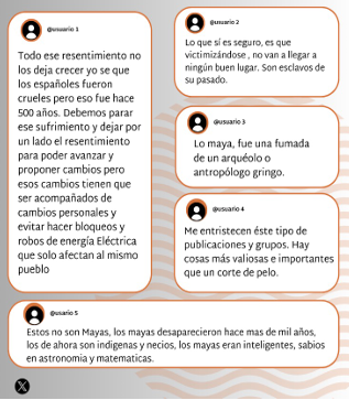 Racismo digital en Guatemala: la población maya guatemalteca enfrenta un sistema racista estructural que coloca a cada grupo en una posición determinada dentro del orden social, y normaliza y perpetúa la discriminación cotidiana y la exclusión de los pueblos indígenas a través de estereotipos y prejuicios reforzados por las elites económicas, políticas y militares (Casaús, 2009).1 En este contexto, las redes sociales han emergido como una plataforma clave para la expresión de influencers mayas, quienes han utilizado estos espacios para manifestar el orgullo por su cultura, denunciar el racismo y cuestionar la criminalización de los liderazgos comunitarios. El impacto de estas iniciativas es evidente en el creciente número de seguidores y los comentarios positivos que reciben, y refleja una expansión de la ciudadanía crítica en los entornos digitales. Estos espacios han trascendido su función técnica para convertirse en territorios de identidad y resistencia, donde la resignificación cultural permite la construcción de nuevas formas de expresión colectiva. Además, la apropiación digital ha transformado el ejercicio ciudadano, posibilitando la generación de narrativas alternativas que redefinen la participación en la sociedad y consolidan nuevos modelos de poder desde la ciudadanía digital, como lo proponen Mossberger, Tolbert y McNeal (2007). Sin embargo, estos mismos espacios digitales también han sido escenario de ataques racistas y agresivos, lo que confirma la tendencia de las redes sociales a la polarización y la incitación al odio (Guardado, 2023).
