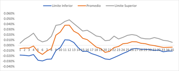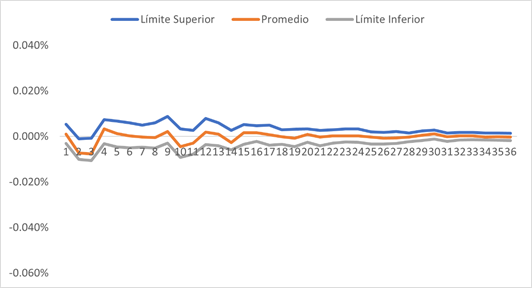 En las Figuras 1 y 2 se presentan las respuestas del desempleo en Puerto Rico ante un aumento inesperado en la tasa de fondos federales, así como a una reducción en la misma, respectivamente. Se puede ver en esta figura que el cambio porcentual en el desempleo aumenta levemente en el próximo periodo, y comienza a aumentar de forma sustancial al cabo de 8 meses como consecuencia del anuncio del aumento inesperado de 1 punto porcentual en la tasa de interés esperada en el futuro. Esto implica que la política más restrictiva de la Reserva Federal durante el periodo bajo estudio puede causar fluctuaciones significativas en el desempleo local, y sus mayores efectos se observan con un rezago de 11 meses luego de implementada la política. Esto implica una respuesta considerable y rápida del desempleo ante aumentos inesperados en la tasa de interés cuando se compara con estudios previos para Puerto Rico como los de Rodríguez y Toledo (2007) y Rodríguez (2018), quienes hallan que un aumento en la tasa de interés de los fondos federales resulta en aumentos en el desempleo local que tarda más de un año en materializarse. Considerando que la tasa de interés utilizada en nuestra estimación es aquella que corresponde a la de los bonos del tesoro de 1 año, esto implica que los efectos de cambios en la política monetaria de Estados Unidos se transmiten con más rapidez aún al mercado laboral en Puerto Rico.