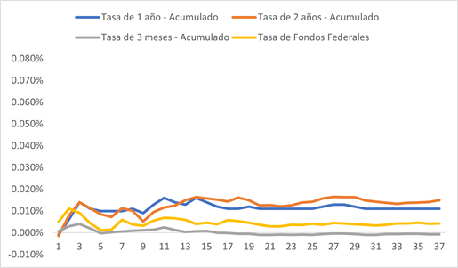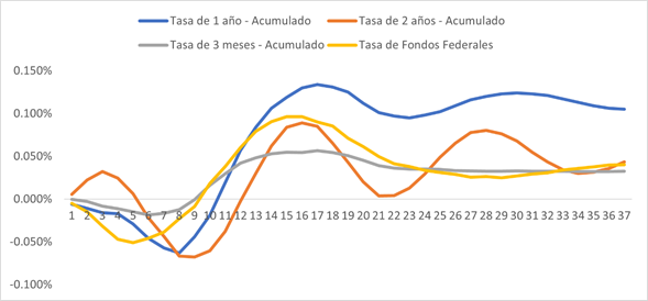 Los resultados de la estimación del impacto de aumentos inesperados en las distintas tasas muestran que el desempleo aumenta de forma más significativa ante un aumento inesperado en la tasa de los bonos a 1 y 2 años, mientras que aumenta por menos si el aumento inesperado es a la tasa de 3 meses y de fondos federales. Esto implica que un anuncio inesperado de un aumento inminente en el corto plazo en las tasas de interés tiene un mayor efecto sobre el desempleo que la implementación de un aumento de forma inesperada, posiblemente porque se acumula el efecto de la anticipación de la política restrictiva en el corto plazo con el efecto de la implementación de la política cuando ocurre.