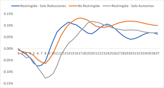 Figura 8 Respuesta de la inflación en Puerto Rico a un aumento inesperado de un punto porcentual en la tasa de interés de los bonos del Tesoro a un año de maduración - Impulsos no restringidos e impulsos restringidos (considerando solo aumentos inesperados en la tasa de interés)