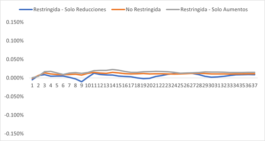 Figura 7 Respuesta de la tasa de crecimiento del desempleo en Puerto Rico a un aumento inesperado de un punto porcentual en la tasa de interés de los bonos del Tesoro a un año de maduración - Impulsos no restringidos e impulsos restringidos (considerando solo aumentos inesperados en la tasa de interés)