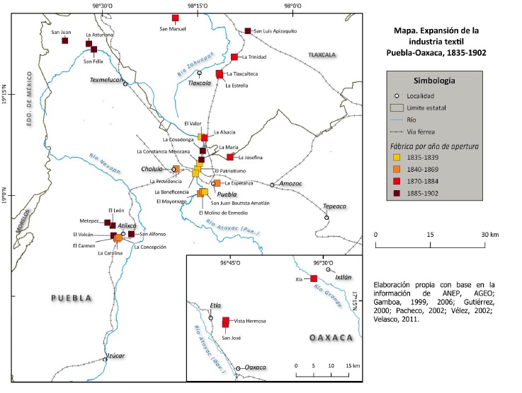 La expansión de la industria decimonónica fue un proceso histórico vinculado con el avance del liberalismo en política y en economía. En ese sentido, la industrialización no era sino la ejecución de los proyectos de modernización de los ramos económicos. En el caso poblano, durante el siglo XVIII, se consolidó un ramo de manufactura textil, sustentado en los obrajes coloniales y en los telares artesanales como centros o unidades de producción. De ahí que se le considere como una protoindustria, dada su importancia para el posterior establecimiento de sistemas de producción y de trabajo netamente industriales.14 Sin embargo, dentro de ese proceso de modernización permanecieron antiguos modos de comprender y de manejar las relaciones socioeconómicas involucradas.15 En la tabla se desglosan las principales fábricas textiles de la zona de estudio, mientras el mapa indica la distribución espacial del proceso, a lo largo del siglo XIX.