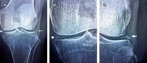 Figura 1: A) Radiografía simple anteroposterior de rodilla izquierda; se observa calcificación lineal de ambos meniscos, sin presencia de disminución de espacio articular, geodas ni osteofitos marginales. B y C) Acercamientos.