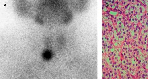 Figura 2: A) Imagen de gammagrama con Tc99-MIBI; muestra zona de hipercaptación en polo inferior de lóbulo tiroideo derecho. B) Corte histológico de adenoma paratiroideo; se observan células claras con patrón de crecimiento difuso y red capilar sinusoidal, rodeando células poligonales con citoplasma claro, núcleos redondos, monótonos e hipercromáticos, sin datos de malignidad.