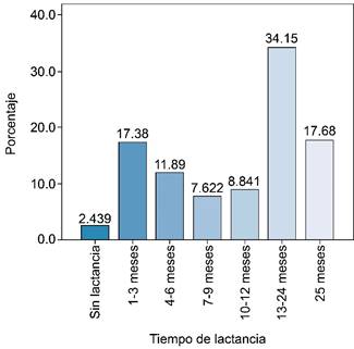 El periodo de lactancia más común abarcó desde 13 hasta 24 meses, representando 34.1% de las muestras. El segundo periodo fue de 25 meses o más, con 17.7%, seguido por un tercer periodo de lactancia más común que osciló entre uno y tres meses, que representó 17.4% del total (Figura 2).