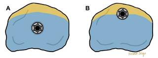 Figura 2: Representación del sitio de entrada del tornillo con la técnica trasarticular (A) e intraarticular (B).