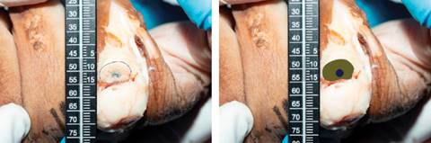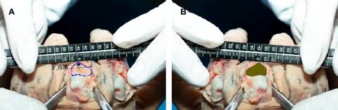 Área dañada = (Área de la cabeza del tornillo y materiales desplazados) / (Área articular) × 100
