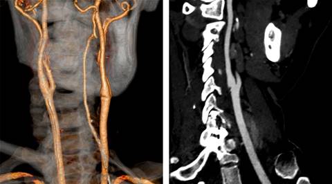 Figura 1: Imagen por tomografía computarizada 3D y fase arterial que revelaron un defecto de llenado focal, lobulado, intimal, en la pared posterior del bulbo carotídeo.