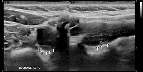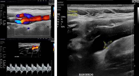Figura 2: A) Imagen Doppler color y espectro que demostraron cambios en la dirección del flujo vascular adyacente a la protrusión intimal y de flujo turbulento en ambas direcciones. B) Imagen por ultrasonido 2D longitudinal que demostró en la pared posterior del bulbo carotídeo derecho una banda isoecogénica intimal que protruye hacia el lumen arterial.