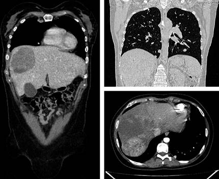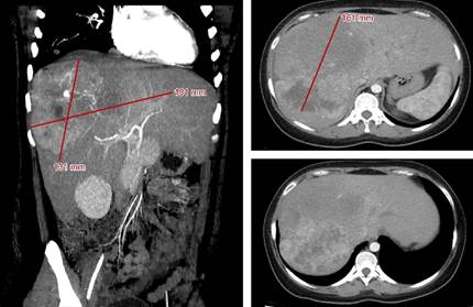 Se trata de paciente femenino de 20 años que acudió a urgencias con dolor abdominal difuso, náuseas y vómitos. La tomografía computarizada reveló una lesión heterogénea de 181 × 131 × 161 mm con múltiples lesiones satélites que abarcaban los segmentos V, VI, VII y VIII, así como nódulos pulmonares (Figura 1). La biopsia hepática central de la lesión reveló células neoplásicas con abundante citoplasma estromal granular y grandes áreas de fibrosis, CK7+, Hepar1+, compatibles con hepatocarcinoma fibrolamelar bien diferenciado. Fue considerado irresecable, por lo que se estableció un régimen paliativo consistente en tres sesiones de TACE con doxorrubicina cada 21 días a partir del 15 de junio de 2020, además de la participación en un protocolo con el uso de atezolizumab más bevacizumab iniciado en julio de 2020 y cumpliendo un total de 22 ciclos. Se logró controlar la enfermedad al mostrar una reducción del tamaño de la lesión del 26.7% (Tabla 1), la cual se mantuvo durante 18.13 meses. Tras la progresión, se valoró una segunda línea de tratamiento con regorafenib; sin embargo, ésta no logró concretarse, por lo que se iniciaron cuidados paliativos hasta el lamentable deceso de la paciente, alcanzando una supervivencia global de 22.23 meses.