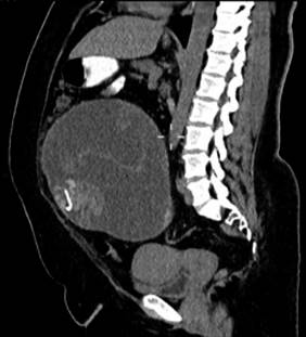 A la exploración física muestra aumento de volumen generalizado en abdomen, indurado, no doloroso a la palpación, peristalsis normoactiva. Estudios de laboratorio dentro de parámetros normales. Rastreo abdominal ecográfico a nivel de hipogastrio con imagen mal definida heterogénea con ecogenicidad de tejidos blandos y áreas lineales hiperecogénicas que proyectan sombra acústica. Tomografía abdominal reporta una imagen ovalada, heterogénea, con pared que realza con el contraste y dos áreas con densidad metal, la cual ejerce efecto de masa sobre estructuras pélvicas (Figura 1). Se realiza laparotomía exploradora identificando masa pseudoquística de 24 × 20 cm y líquido libre escaso, se realiza resección del mismo (Figura 2).