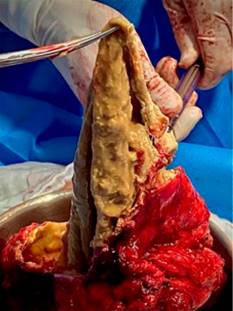 El informe histopatológico reporta la presencia de compresa adherida y contenido purulento dentro de pieza quirúrgica (Figura 3).
