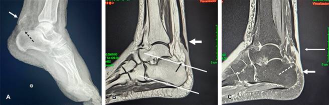 Figura 1: A) Radiografía lateral de tobillo izquierdo que muestra: avulsión del tendón de Aquiles con lámina ósea de la entesis (flecha blanca) en calcáneo con deformidad de Haglund (flecha negra). B) Resonancia magnética (RM) ponderada en T1, se observa avulsión del tendón de Aquiles, desplazado 4 cm (flecha blanca) y trazo de líneas paralelas para corroborar deformidad de Haglund (flecha negra). C) RM en secuencia STIR mostrando las lesiones descritas (flechas), con gran edema de la grasa de Kager.