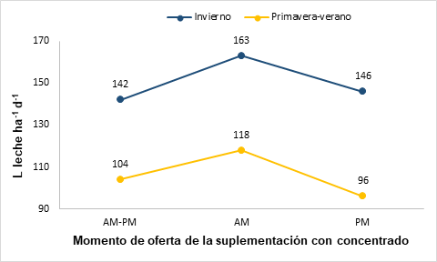El criterio de manejo de pastoreo utilizado permitió lograr la misma eficiencia de utilización de forraje en la pradera, y con ello estimar la carga animal y producción de leche por hectárea. El impacto de la tecnología de suplementar todo el concentrado luego de la ordeña matinal produjo un incremento promedio de 10.2 % en producción individual de leche y resultó en una mejora de 9.9 % en la producción de leche por hectárea. Esta estrategia se tradujo en un impacto positivo en el sistema de producción, sin aumentar los insumos, ya que se basó en cambios circadianos en la composición de forraje y el comportamiento de ingestión de forraje.