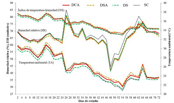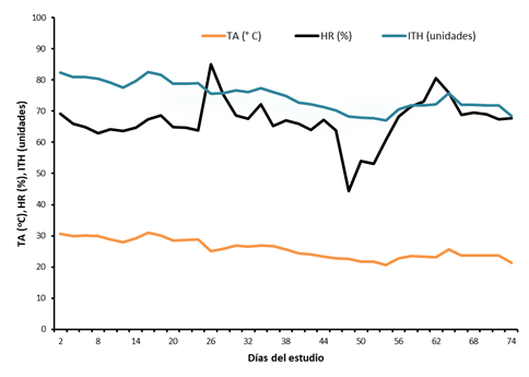 Figura 1 Valores promedio de cada dos días para temperatura ambiente (TA), humedad relativa (HR) y el índice temperatura-humedad (ITH) durante el periodo experimental