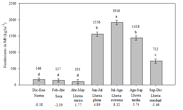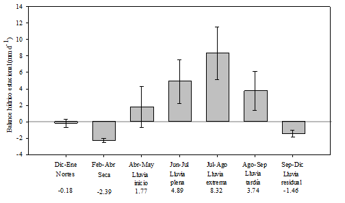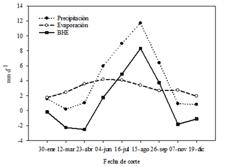 El BHE (mm día-1) considera la precipitación pluvial (mm día-1) como única entrada de agua y la evaporación (mm día-1) como la salida de agua. El cálculo se realizó a partir de la diferencia de precipitación pluvial menos evaporación (Figura 1). El BHE por fecha de corte se determinó diariamente a partir del día del corte de muestreo hasta el día previo al siguiente corte de muestreo (42 días). Las fechas de los cortes fueron: 15 de agosto, 26 de septiembre, 07 de noviembre y 19 de diciembre del 2011, y 30 de enero, 23 de abril y 16 de julio del 2012. Los resultados de BHE diario fueron promediados cada 42 días con el fin de obtener un valor representativo de cada fecha de muestro. Los promedios de BHE (mm día-1) se agruparon en siete estaciones del año como: “Nortes” -0.18 ± 0.67 (dic-ene); Seca -2.39 ± 0.26 (feb-abr); Lluvia inicio 1.77 ± 2.49 (abr-may); Lluvia plena 4.89 ± 2.66 (jun-jul); Lluvia extrema 8.32 ± 3.20 (jul-ago); Lluvia tardía 3.74 ± 2.34 (ago-sep); Lluvia residual -1.46 ± 0.39 (sep-dic). Siendo las estaciones del año los siete tratamientos (Figura 2).