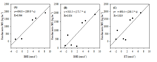 (A) se excluyeron los valores de transición (abr-may) y (sep-dic) en donde la condición hídrica del suelo influye sobre el rendimiento. (B) se incluyen las 7 estaciones del año clasificadas por BHE. (C) se regresa el rendimiento de MS sobre la evapotranspiración (ET, mm d-1).