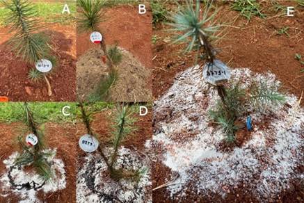Los tratamientos se aplicaron por primera vez el 17 de octubre de 2022 y en tres ocasiones más: 16 de enero, 17 de abril y 17 de julio de 2023, en el área próxima al tallo que cubría la circunferencia del área de interés (Figura 2).