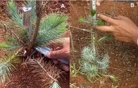 Se registraron datos cada tres meses durante un año (octubre de 2022 a octubre de 2023); las variables fueron: altura de planta (cm), medida con una regla graduada (marca TKM ®, modelo 675); diámetro basal (mm), con un Vernier (marca Lion ®, modelo Análogo) (Figura 3). Con estos datos se determinó el Índice de Esbeltez, que representa la relación entre la altura (cm) y el diámetro (mm) (Gerding et al., 2006; Montes-Rivera et al., 2001), el cual es un indicador de la resistencia a la desecación, supervivencia y crecimiento potencial de la planta en sitios secos, cuyo valor debe ser menor a seis (Prieto et al., 1999); el número de brotes (Venegas-González et al., 2016) (Figura 3), y en la última fecha de medición se obtuvo el promedio de diámetro de copa (cm) (Viveros-Viveros et al., 2005) y de la rama de mayor longitud (cm) (Sáenz-Romero et al., 1994) con una regla graduada (marca TKM ®, modelo 675).