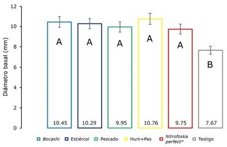 De acuerdo con los resultados de la prueba de Tukey (α=0.05), todos los tratamientos con enmienda incrementaron el diámetro basal en comparación con el testigo, lo cual permitió que se formara un mismo grupo estadístico (Figura 4). Cabe destacar que la enmienda a base de ácidos húmicos más extracto de pescado presentó un incremento de 40.3 % en diámetro basal, en comparación con el testigo; mientras que, con la enmienda mineral a base de Nitrofoska perfect ® se obtuvo 27.1 % de incremento en diámetro basal con respecto a lo obtenido por el testigo, que fue el tratamiento con menor promedio de diámetro basal (Figura 4).