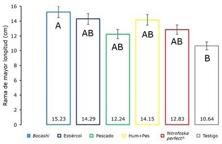A partir de los resultados de la prueba de Tukey (α=0.05), la enmienda a base de bocashi incrementó en 43 % la rama de mayor longitud en comparación con el testigo, lo que a su vez permitió formar un mismo grupo estadístico con el resto de tratamientos que contenían algún tipo de enmienda. Los tratamientos a base de extracto de pescado y Nitrofoska perfect ® registraron los promedios más bajos (Figura 5).